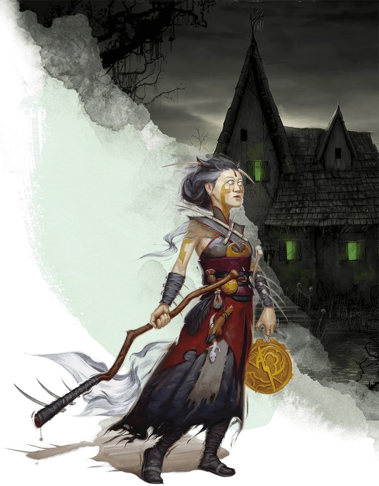 As flames spring to life in her hands, a wizened human whispers the secret name of her demonic patron, infusing her spell with fiendish magic.